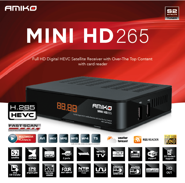 De MINI HD265 van Amiko is een Full HD digitale HEVC satellietontvanger met een ingebouwde Conax smartcardlezer en 12V aansluiting. Door zijn compacte afmetingen en externe IR oog is de Mini HD265 een ideale ontvanger voor gebruik in uw camper, caravan boot of vrachtwagen en compleet weg te werken in uw interieur.