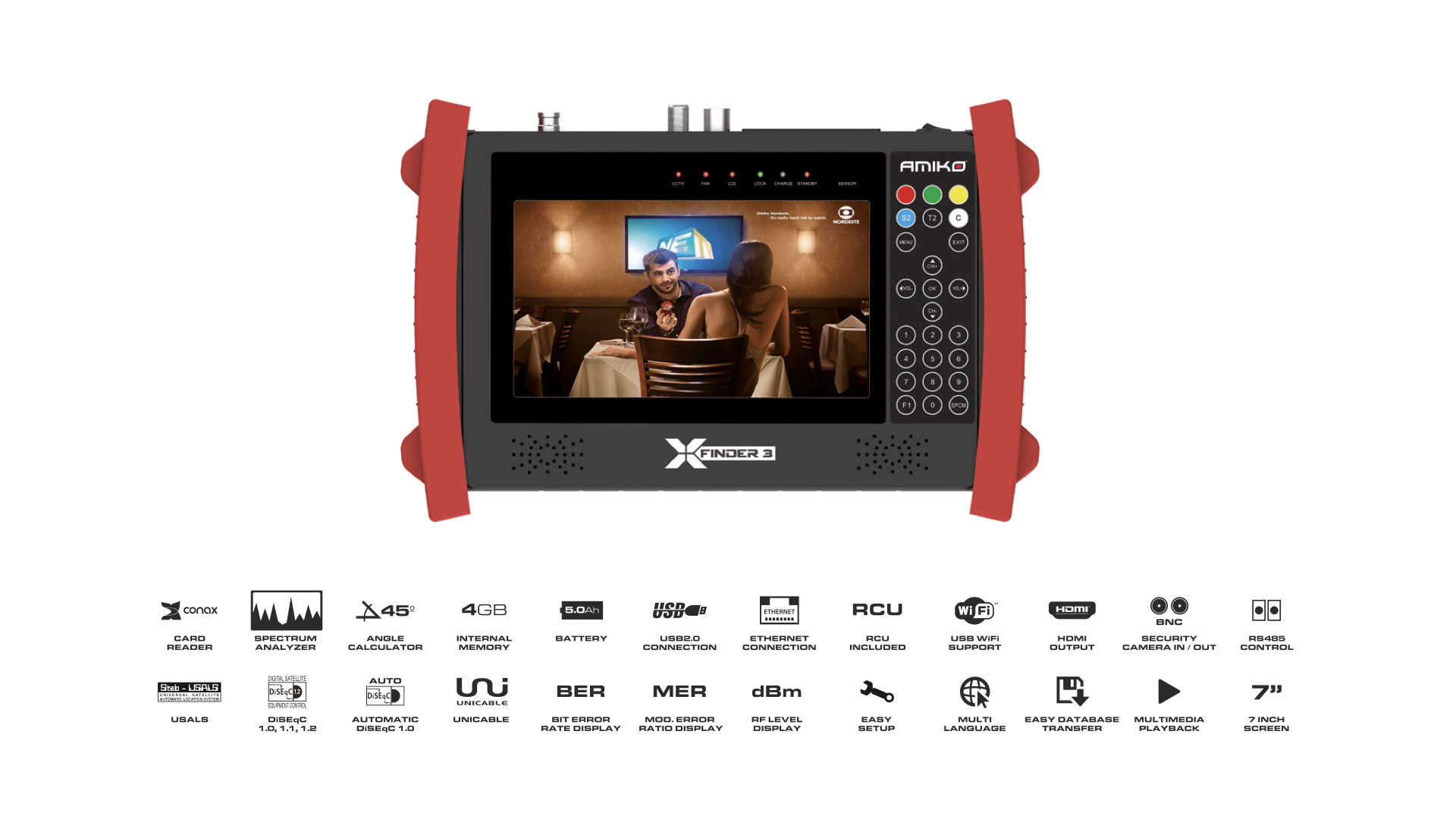 Met de Amiko Xfinder 3 SE meet u zoals een professional. De 3 SE is geschikt voor het meten van DVB-S / DVB-S2 / DVB-T / DVB-T2 en DVB-C signalen. De veelzijdige meter ondersteunt zelfs de nieuwe H.265/HEVC-ontvangsttechnologie en is ook geschikt voor het testen van CCTV-systemen zoals AHD / CVI / TVI / CVBS. De 3 SE is uitgerust met een 7-inch LCD-scherm, HDMI IN/OUT functie, CI-slot, kaartlezer en een ethernet verbinding.