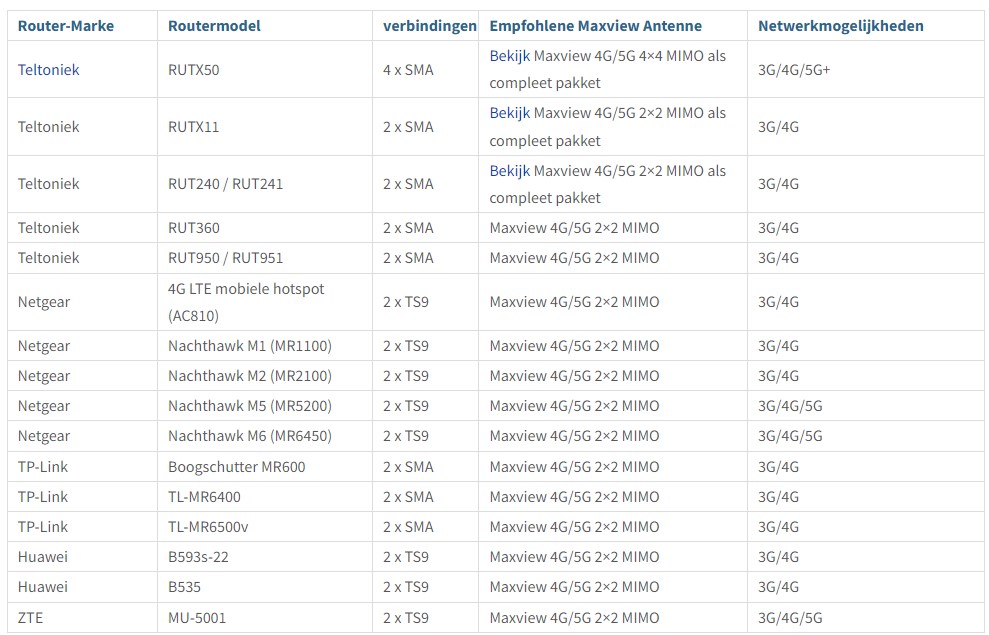 Er zijn verschillende gangbare routermodellen met externe antenne-aansluitingen. Deze omvatten Teltonika, Netgear, TP-Link, Huawei, ZTE en vele anderen.