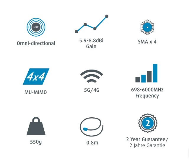 De externe antenne bestrijkt alle 5G- en 4G-frequentiebereiken tot 6000 MHz, met een versterking tot 8,8 dBi.