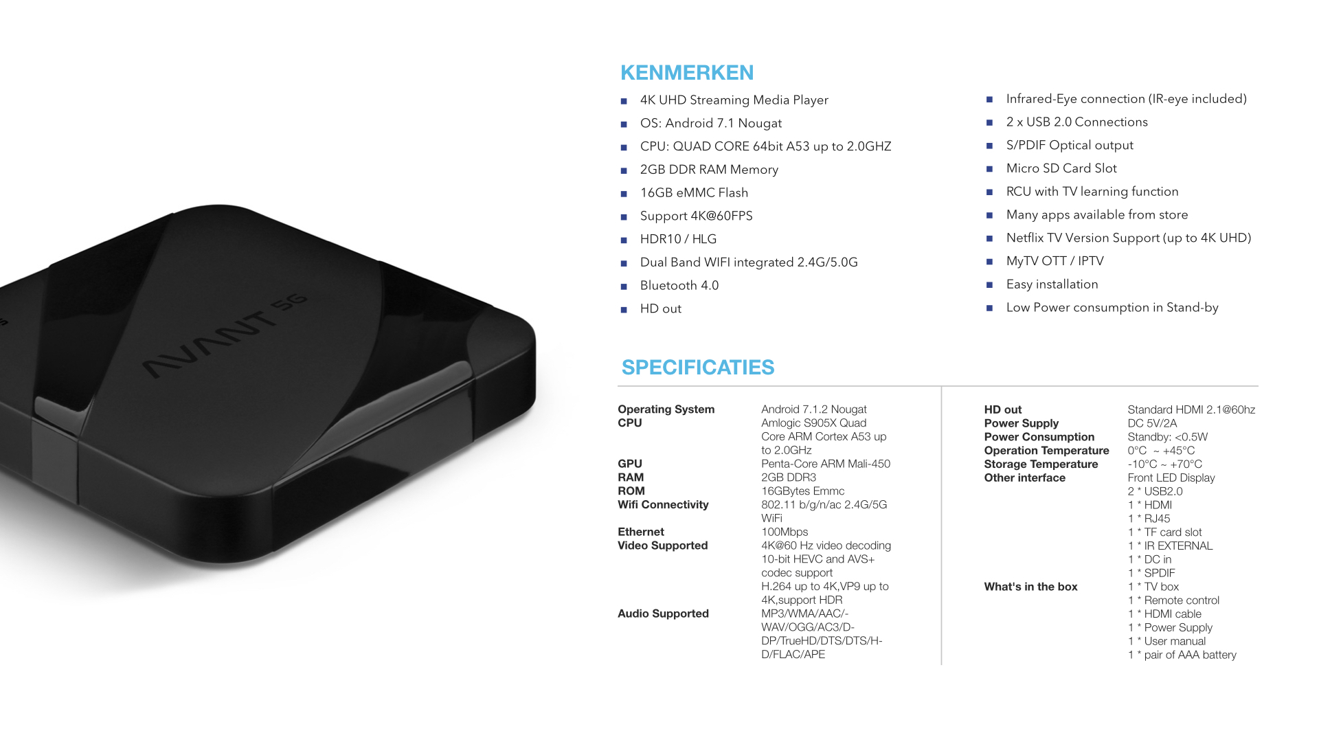 De AVANT 5G is een OTT mediaspeler van Xsarius die draait op Android 7.1 Nougat. Met de Google Play store heeft u toegang tot eindeloze apps voor nog meer content op uw televisie. De Avant is uitgerust met een quad-core processor en ondersteund singleband WiFi (2,4 GHz/5G WiFi) en u heeft tot wel 4K 60FPS beeldondersteuning. Door zijn compact formaat en de bijgeleverde infrarood oog kunt u gemakkelijk de Avant 5G wegwerken in uw interieur. Inclusief een afstandsbediening met leerfunctie. Hiermee kunt u uw tv en rand-apparaten beheren met een druk op de knop.