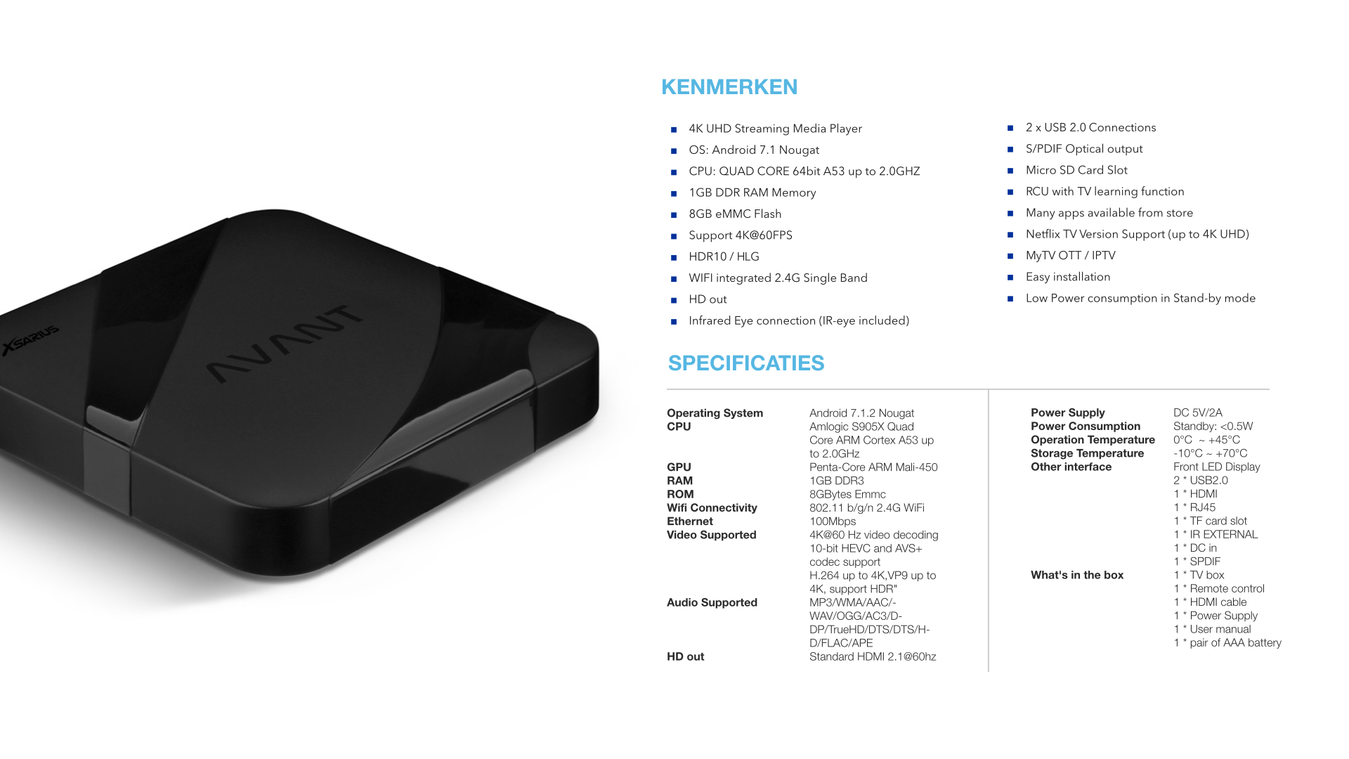 De AVANT is een OTT mediaspeler van Xsarius die draait op Android 7.1 Nougat. Met de Google Play store heeft u toegang tot eindeloze apps voor nog meer content op uw televisie. De Avant is uitgerust met een quad-core processor en ondersteund singleband WiFi en u heeft tot wel 4K 60FPS beeldondersteuning. Door zijn compact formaat en de bijgeleverde infrarood oog kunt u gemakkelijk de Avant wegwerken in uw interieur. Inclusief een afstandsbediening met leerfunctie. Hiermee kunt u uw tv en rand-apparaten beheren met een druk op de knop.