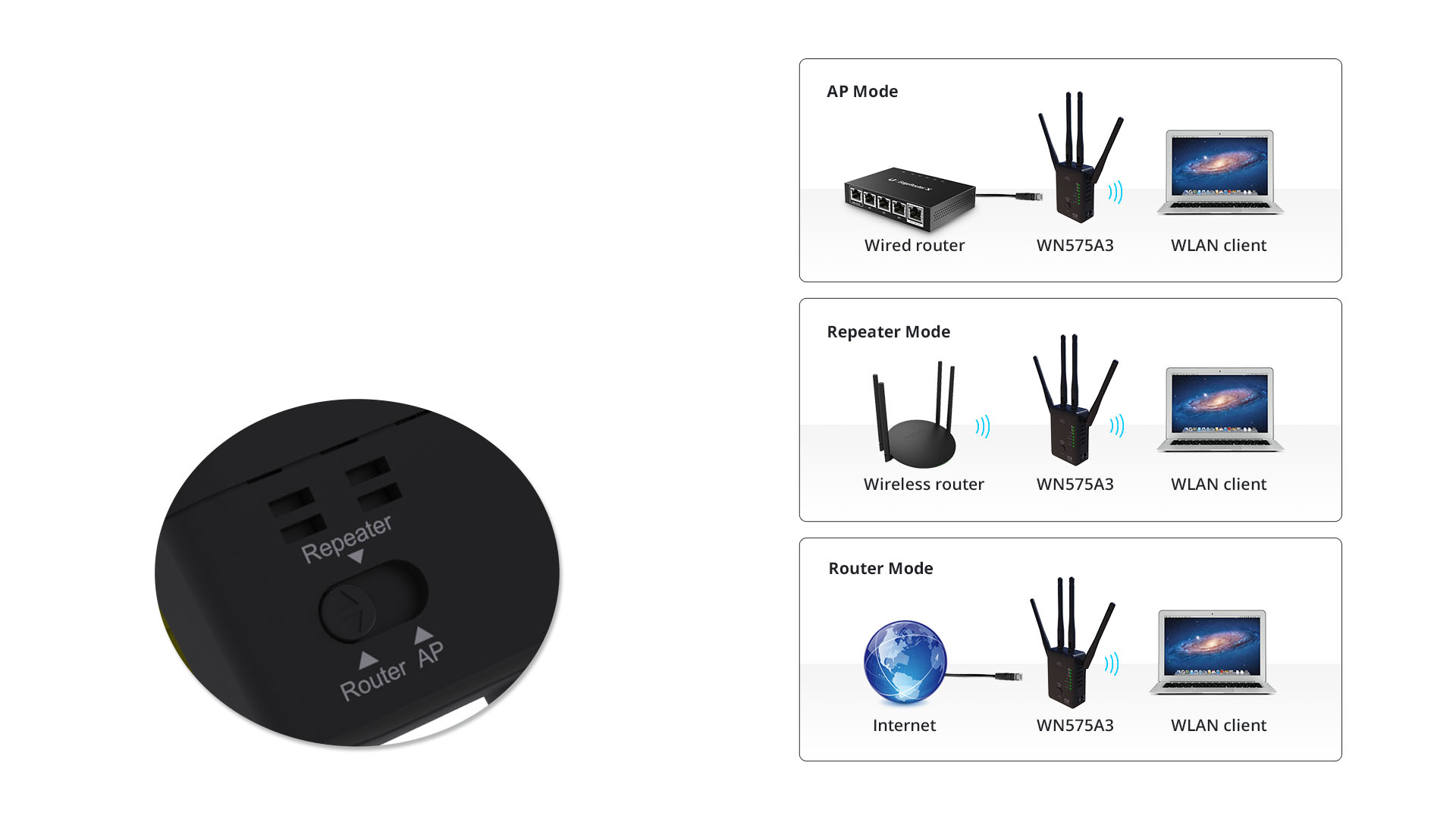 Als router: Als u de Wifi versterker als router wilt gebruiken, kunt u dat vrij eenvoudig doen. Sluit gewoon een Ethernet-kabel van uw modem aan op de Wifi versterkers Ethernet-poort.Als toegangspunt (Accespoint): Als u de draadloze verbinding naar andere delen van uw huis wilt uitbreiden, stelt u de Wifi versterker in als toegangspunt. Neem uw Wifi versterker en bewaar deze in AP-modus. U moet deze via een Ethernet-kabel op de router aansluiten.