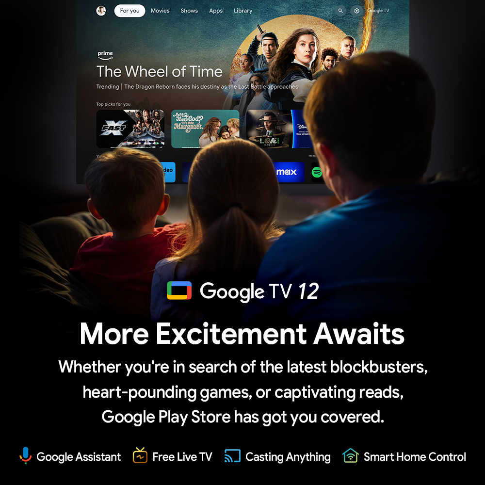 Dankzij de officiële Google TV-interface (Android TV 12) krijg je een overzichtelijk en gepersonaliseerd startscherm met contentaanbevelingen op maat. Stream duizenden apps via de Google Play Store, waaronder Netflix, YouTube, Disney+, MAX, Prime Video en meer.