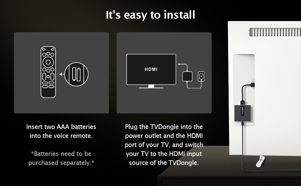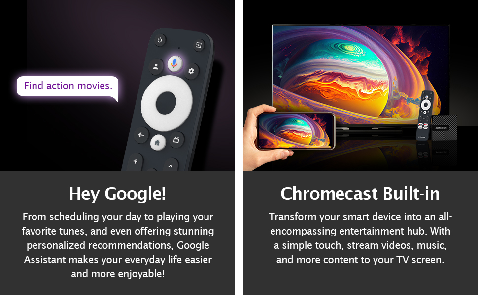 De meegeleverde Bluetooth-afstandsbediening biedt intuïtieve bediening met Google Assistant-spraakbesturing. Richt hem niet op het scherm – gebruik hem overal in de kamer, zonder direct zicht op de dongle nodig te hebben.