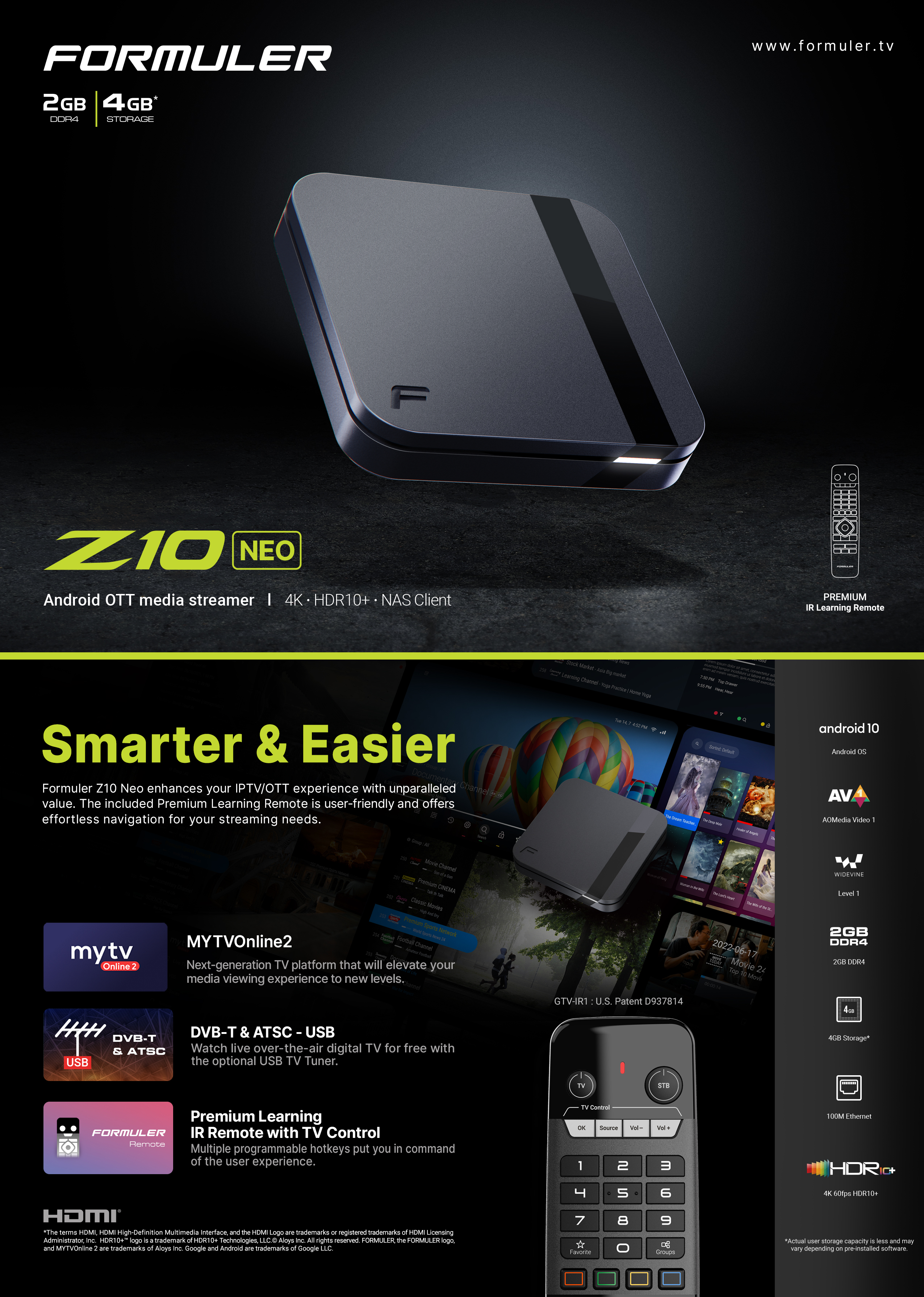 | Inhoud van de verpakking | • Formuler Z10 Neo IPTV Box • Handleiding • GTV-IR Afstandsbediening • 2x AAA batterijen • HDMI Kabel • 12V Voeding |