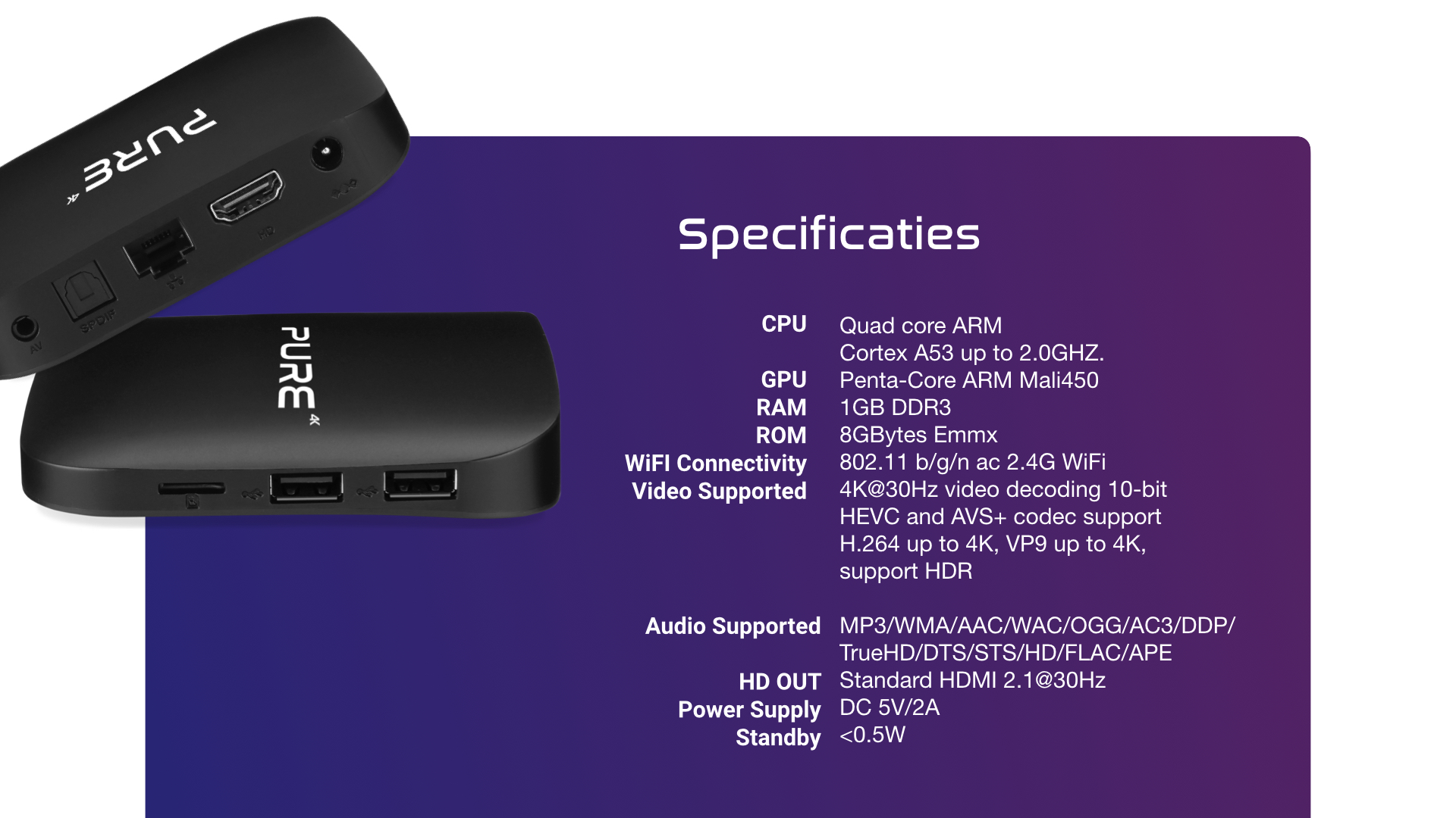 De Xsarius PURE 4K OTT is de meest compacte en krachtige OTT / IPTV Set-Top Box en mediaplayer op de markt die draait op Android 7.1 Nougat. U heeft onbeperkt toegang tot uw favoriete tv progamma's met de voorgeinstalleerde PremiumTV app. Zo kunt u optimaal genieten op iedere locatie waar een internet verbinding mogelijk is. De PURE 4K OTT is uitgerust met een snelle quad-core processor, een gigabit ethernetpoort en ondersteund singleband wifi (2,4 GHz).