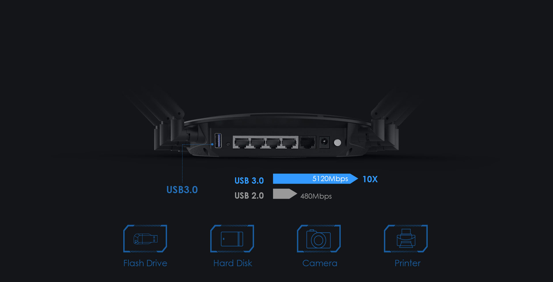 Op deze router zit een USB3.0-poort, ongeveer 10 keer sneller dan USB2.0, voor snellere datatransmissie, mediaopslag en het delen van media via uw netwerk.Gebruiksvriendelijke interface