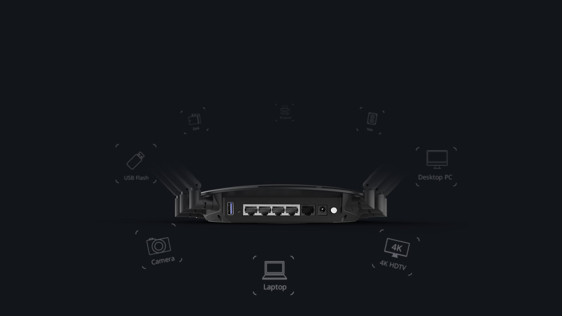 Vijf Gigabit Ethernet-poorten, 10x sneller dan Fast Ethernet, deze kunnen worden samengevoegd om de verbindingssnelheid naar bekabelde computers, printers en andere netwerkapparaten te verdubbelen met ultrasnelle bekabelde snelheden.