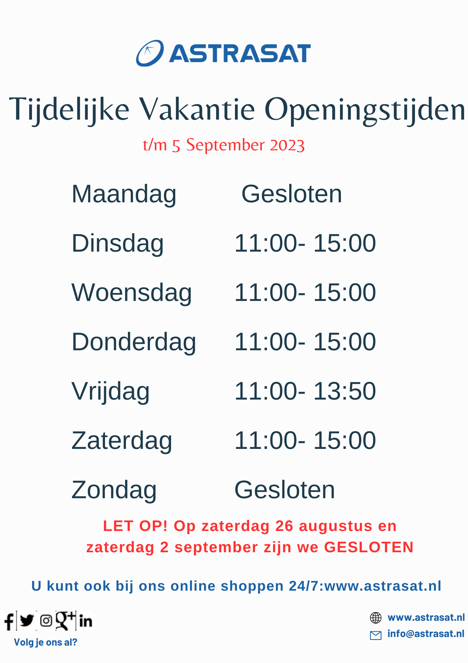 Dit zijn de reguliere openingstijden van onze Astrasat winkel en showroom in Groningen aan de Bornholmstraat 8, 9723 AX Groningen.
