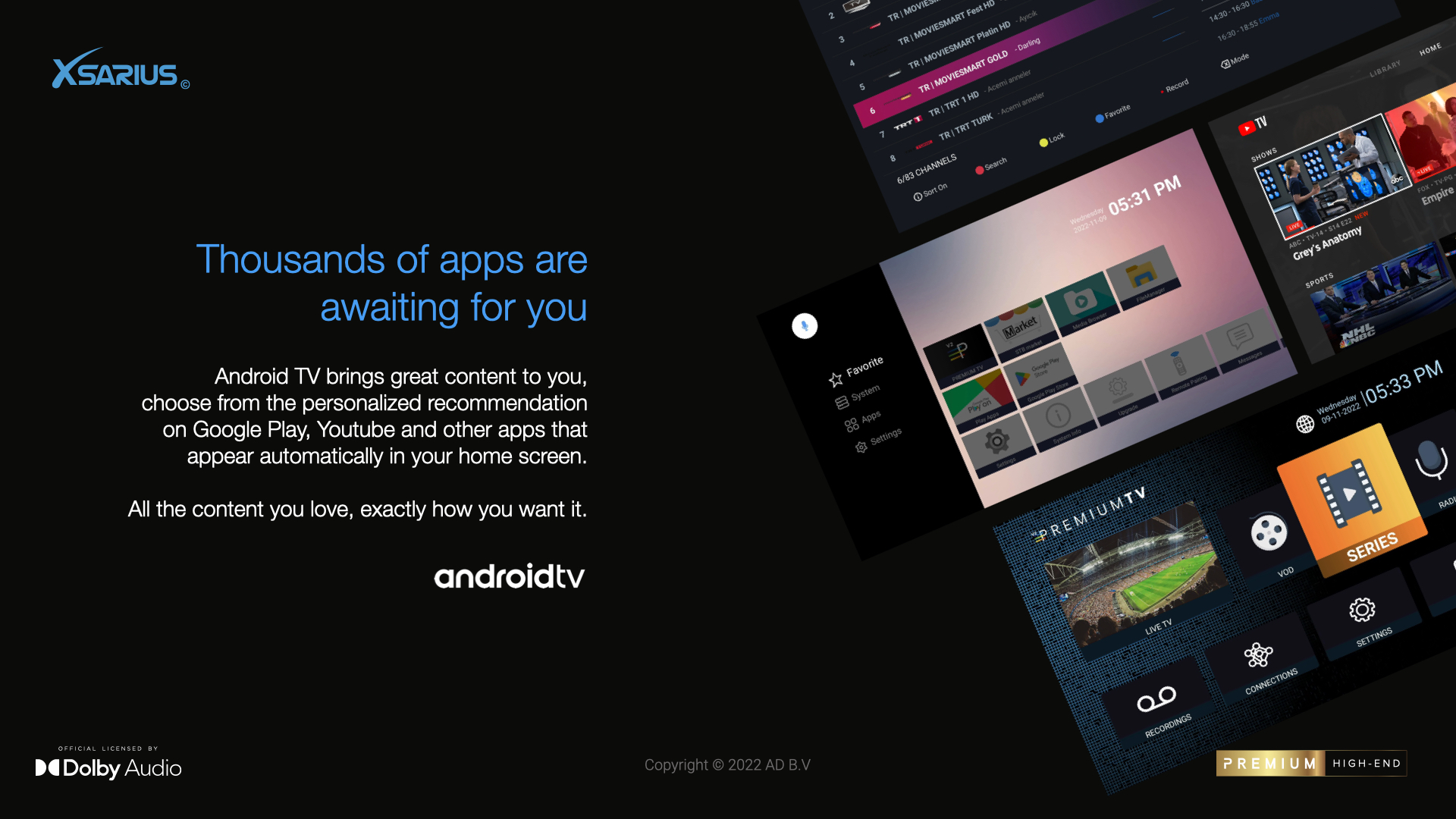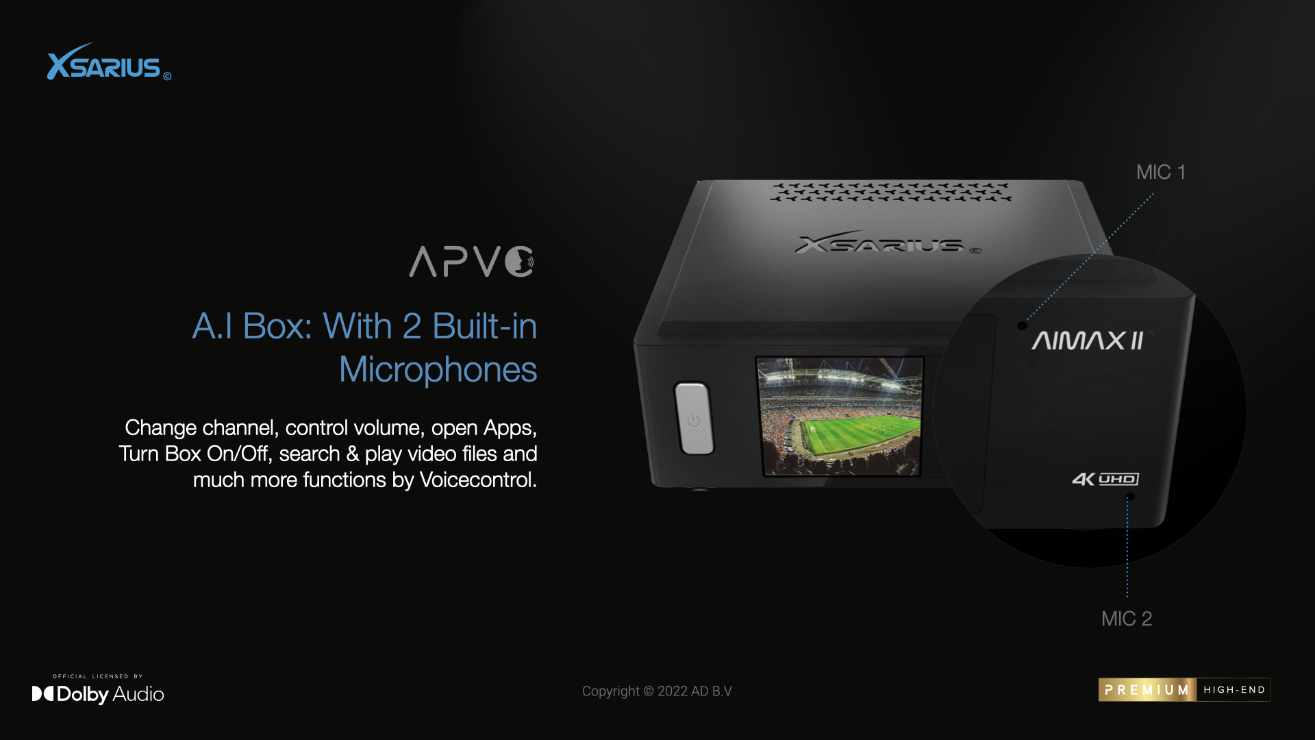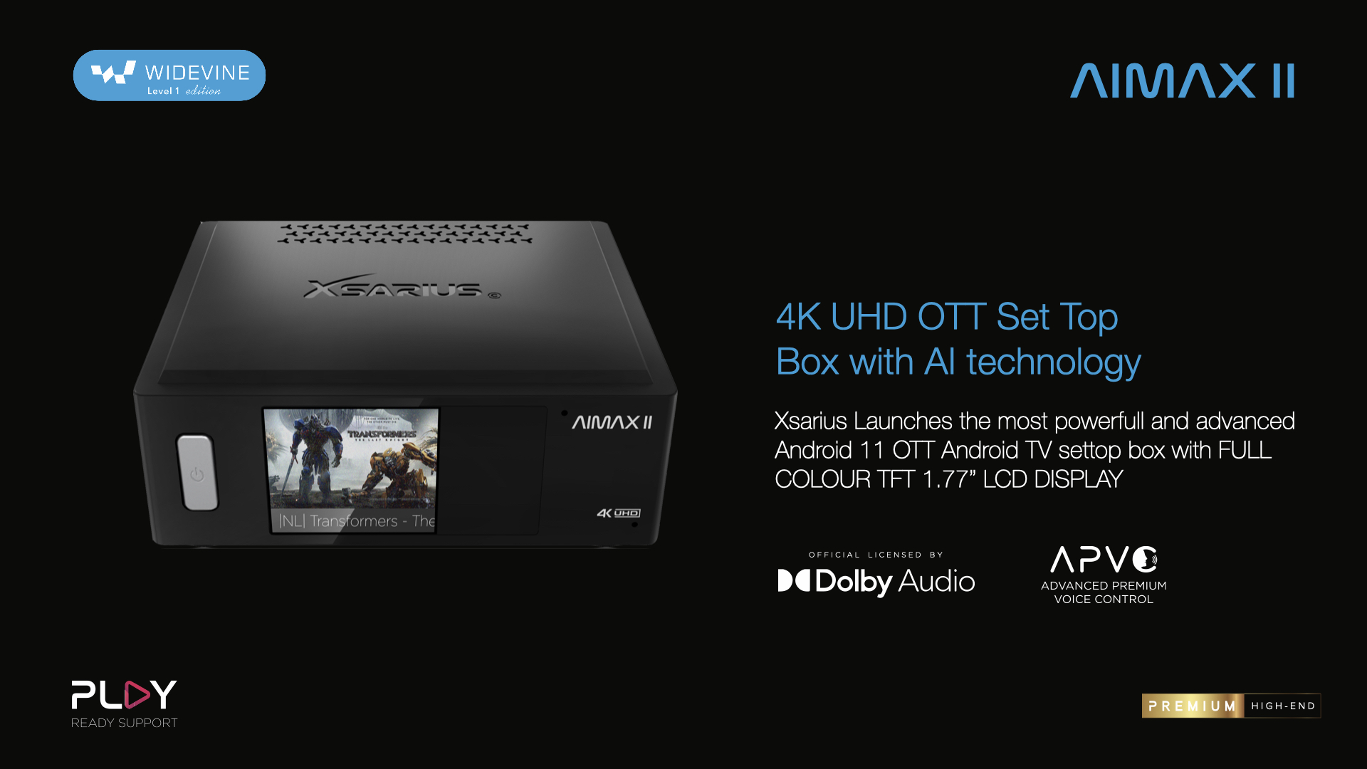 De Xsarius Aimax 2 Android TV 11 Mediastreamer. De snelste en meest geavanceerde Xsarius High-End mediastreamer.Ervaar de ultieme tv-kijkervaring met Android 11 en de nieuwste Mali-G57 grafische processor. Krijg toegang tot premium en Ultra High-End met AV-1 technologie, Widevine Level1 en PlayReady ondersteuning waarmee je talloze applicaties download en geniet van de beste beeld- en audiokwaliteit.