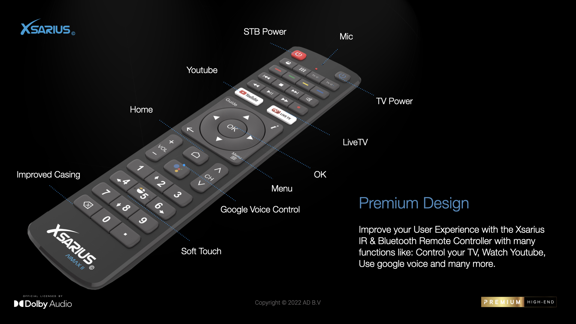 - Apps: Netflix, Youtube 4K, PREMIUMTV 2 en Google Voice Control