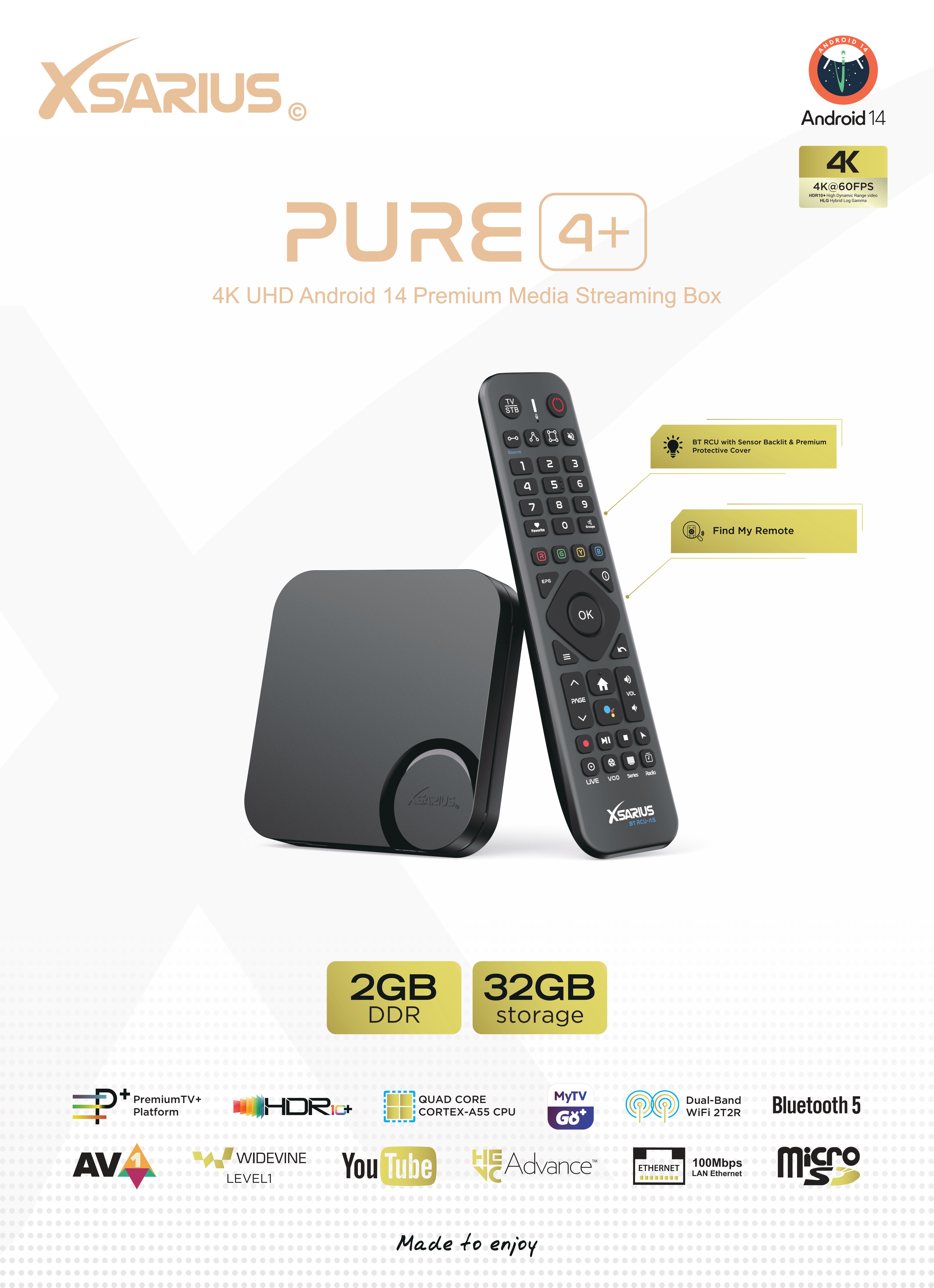 Ervaar de ultieme wow-factor met de Xsarius Pure 4+, de nieuwste 4K UHD-streamingbox die entertainment opnieuw definieert. Geniet van levensechte beelden in HDR10+, razendsnelle prestaties dankzij Android 14 en een Quad-Core processor, en profiteer van Bluetooth 5 voor snelle en stabiele verbindingen met al je randapparatuur. Met 32 GB opslag en 2 GB RAM heb je meer dan genoeg ruimte voor al je apps en media.